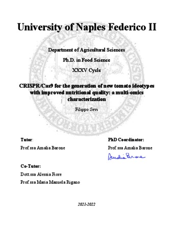Sevi, Filippo (2023) CRISPR/Cas9 for the generation of new tomato ideotypes with improved nutritional quality: a multi-omics characterization. [Tesi di dottorato]