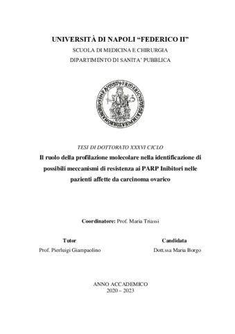 | Titolo: | Il ruolo della profilazione molecolare nella identificazione di possibili meccanismi di resistenza ai PARP Inibitori nelle pazienti affette da carcinoma ovarico |