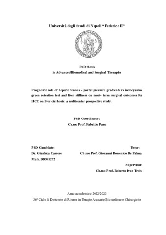Cassese, Gianluca (2023) Prognostic role of hepatic venous portal pressure gradients vs indocyanine green retention test and liver stiffness o n short term surgical outcomes for HCC o n liver cirrhosis : a multicenter prospective study. [Tesi di dottorato]