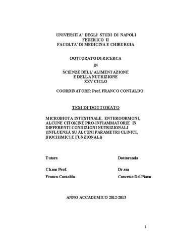 Del Piano, Concetta (2013) MICROBIOTA INTESTINALE, ENTEROORMONI, ALCUNE CITOKINE PRO-INFIAMMATORIE IN DIFFERENTI CONDIZIONI NUTRIZIONALI (INFLUENZA SU ALCUNI PARAMETRI CLINICI, BIOCHIMICI E FUNZIONALI). [Tesi di dottorato]